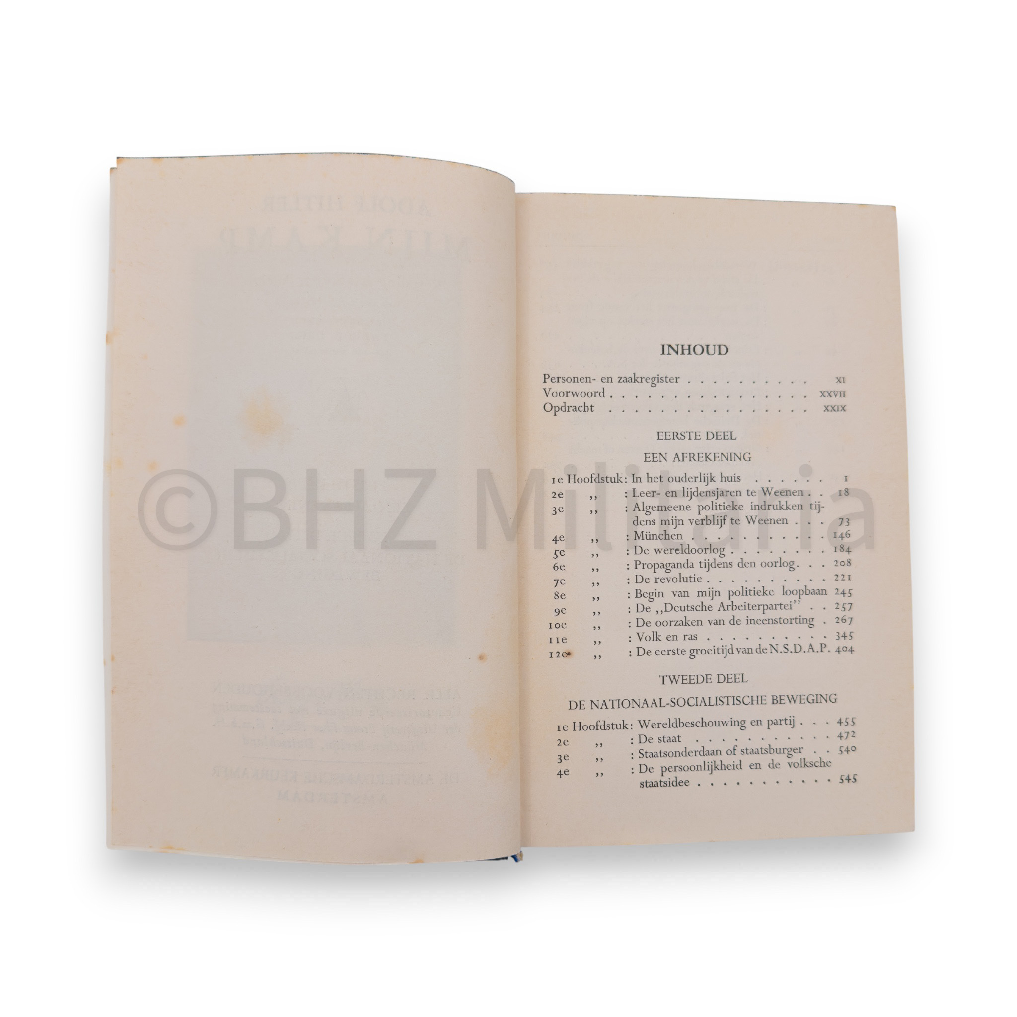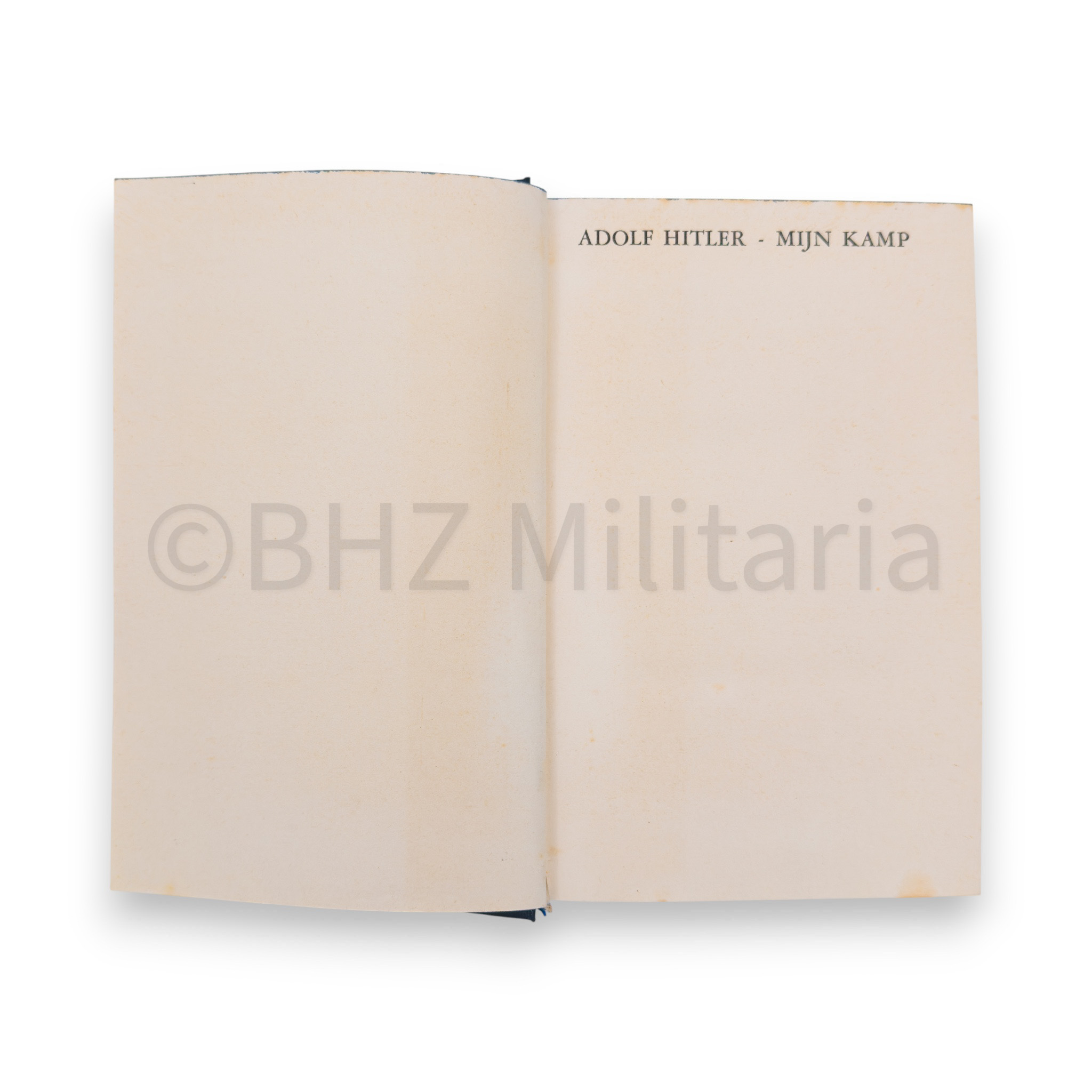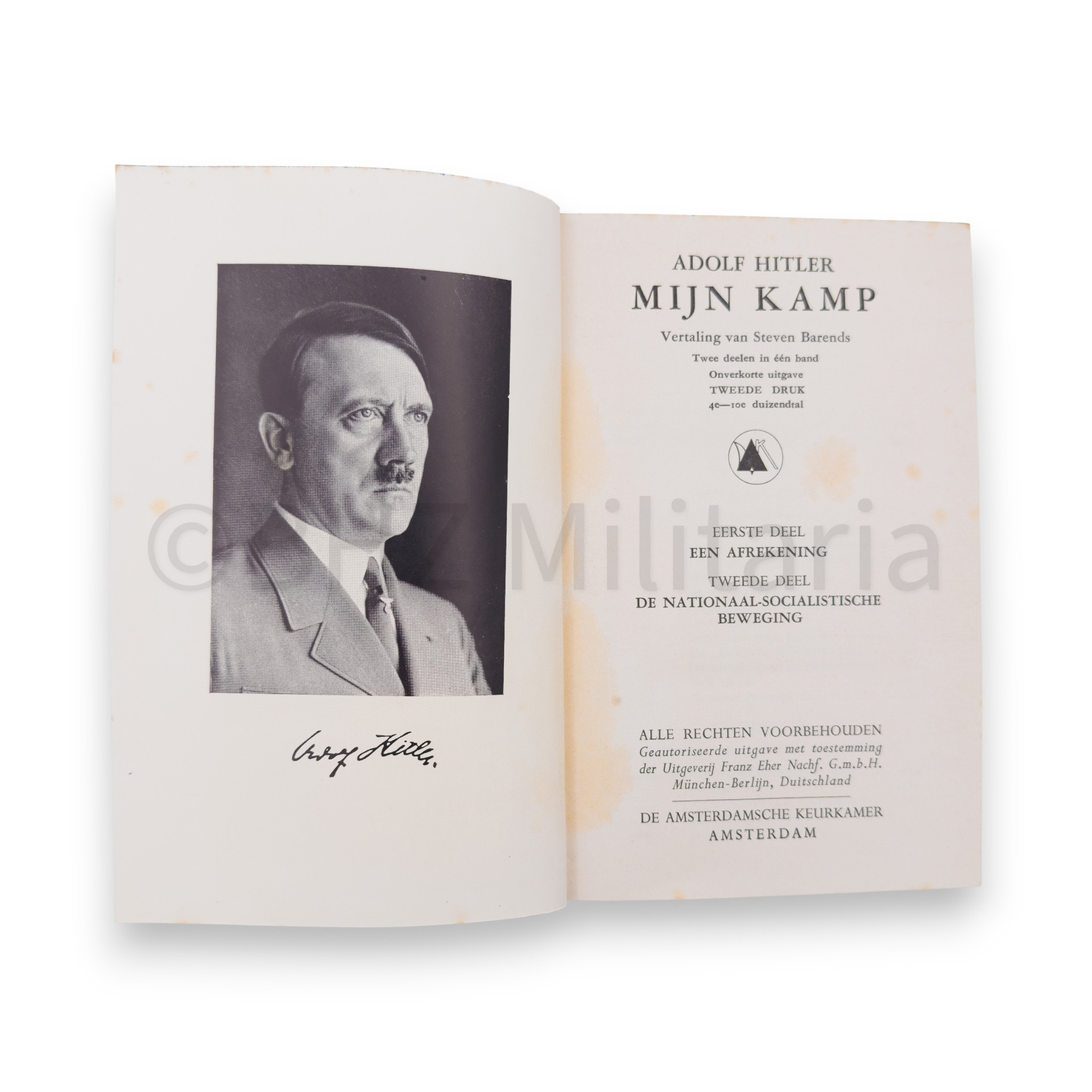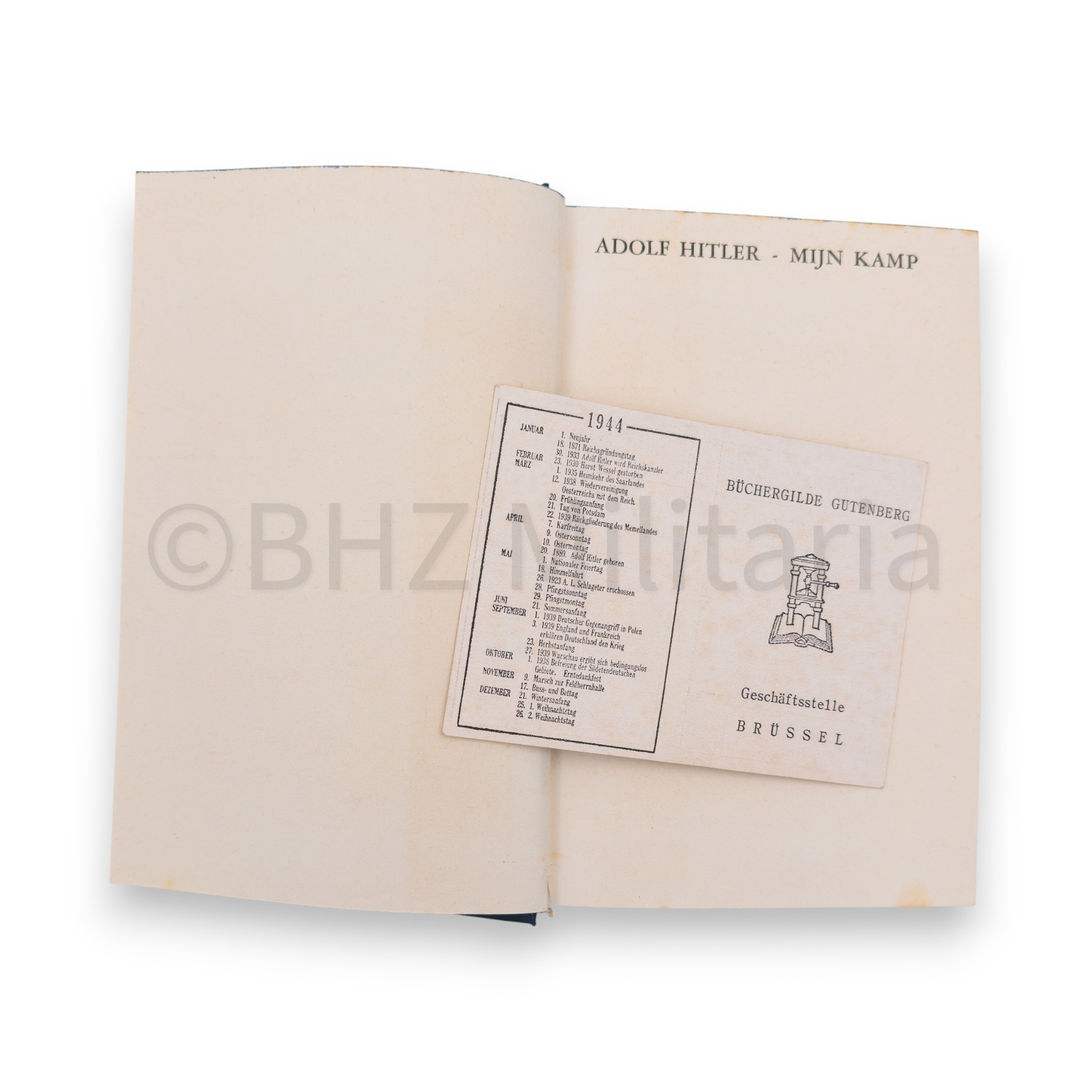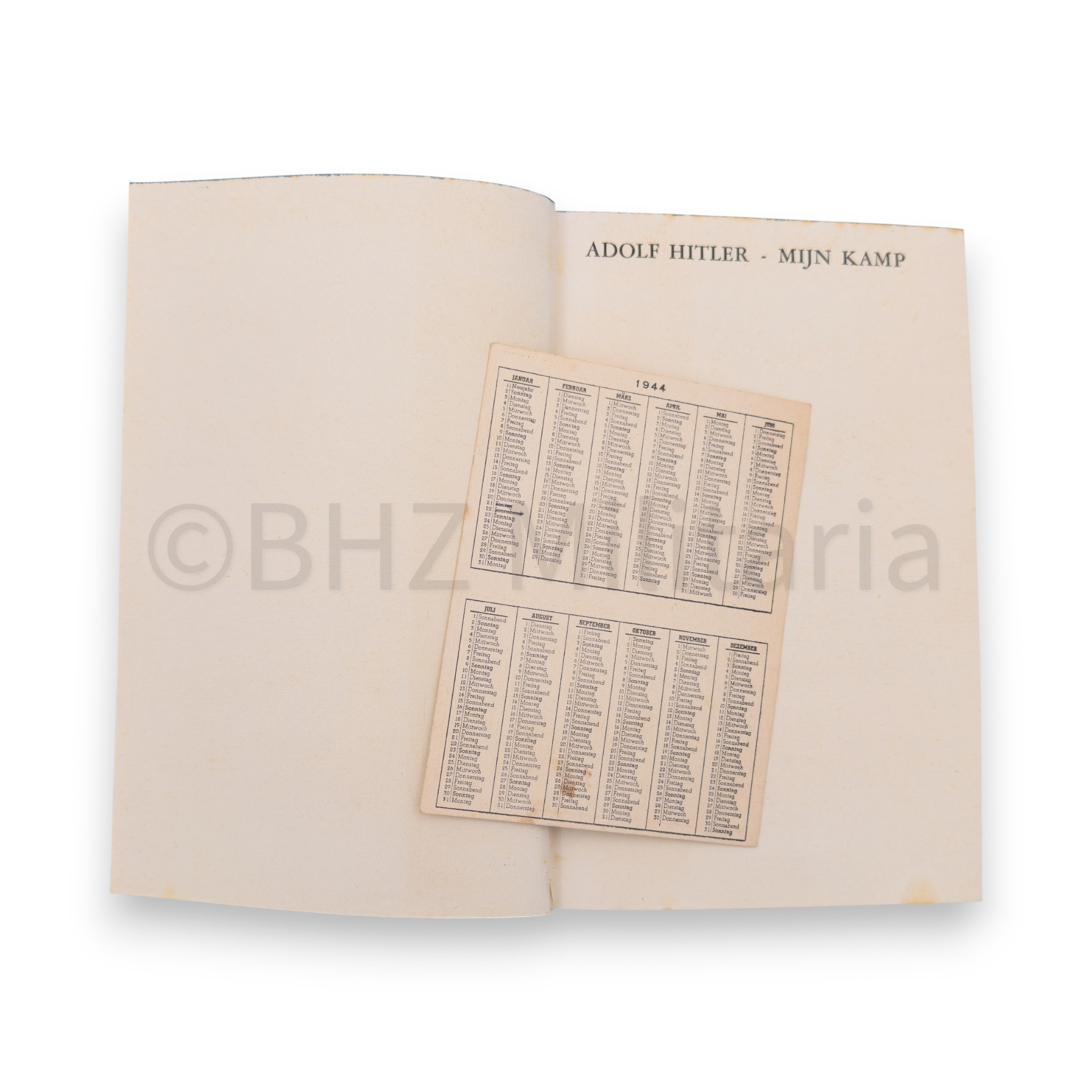 2e Druk van de Nederlandse versie Mijn Kamp (Mein Kampf) vertaald door Steven Barends in zeer goede conditie. Er zitten ook een boekenlegger en kalender 1944 bij.