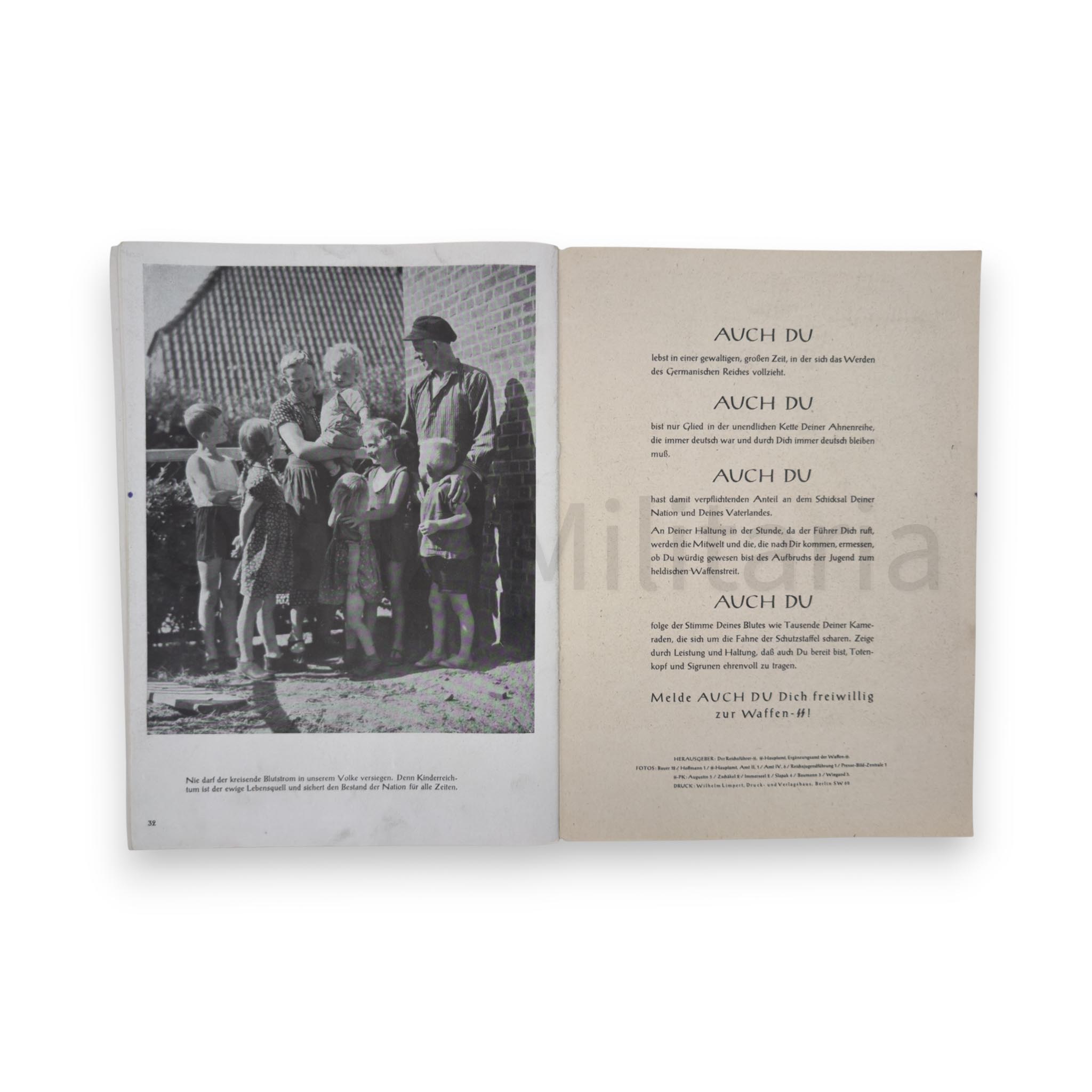 Prachtige en zeldzame originele brochure “Auch Du” van 32 pagina’s op A4 formaat uitgegeven door Der Reichsführer-SS, SS-Hauptamt, Erganzungsamt der Waffen-SS en uitgegeven door Wilhelm Limpert, Druck und Verlagshaus, Berlin.