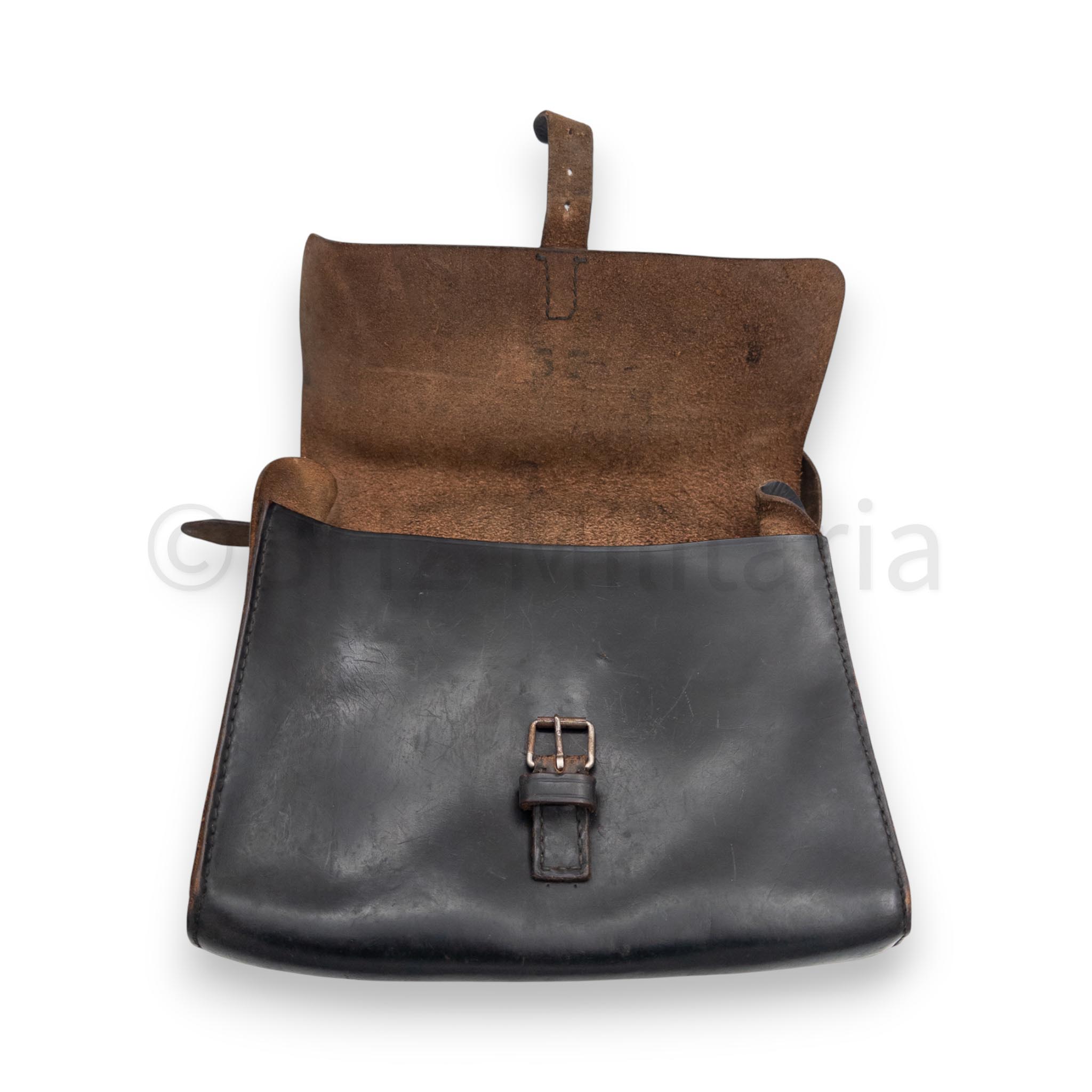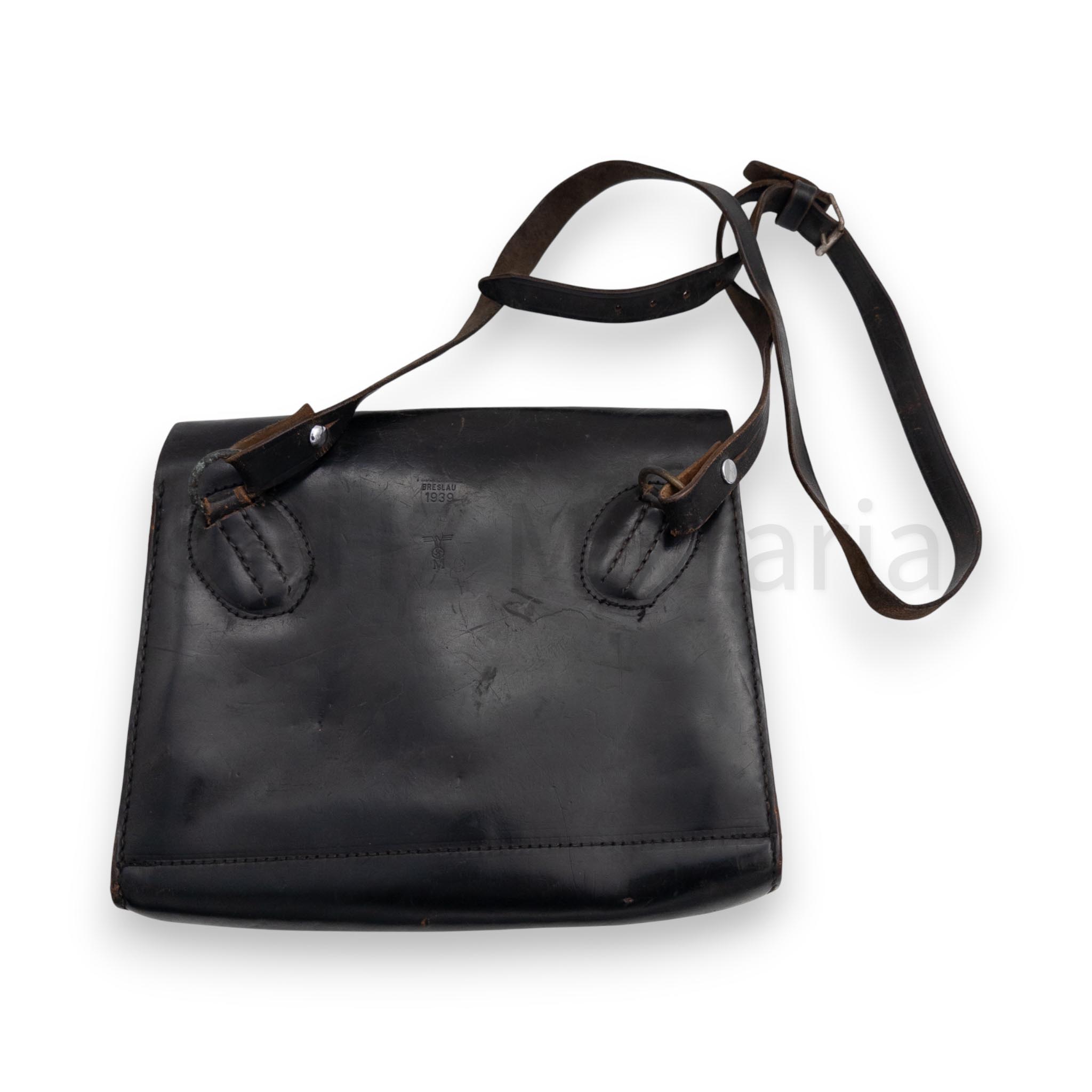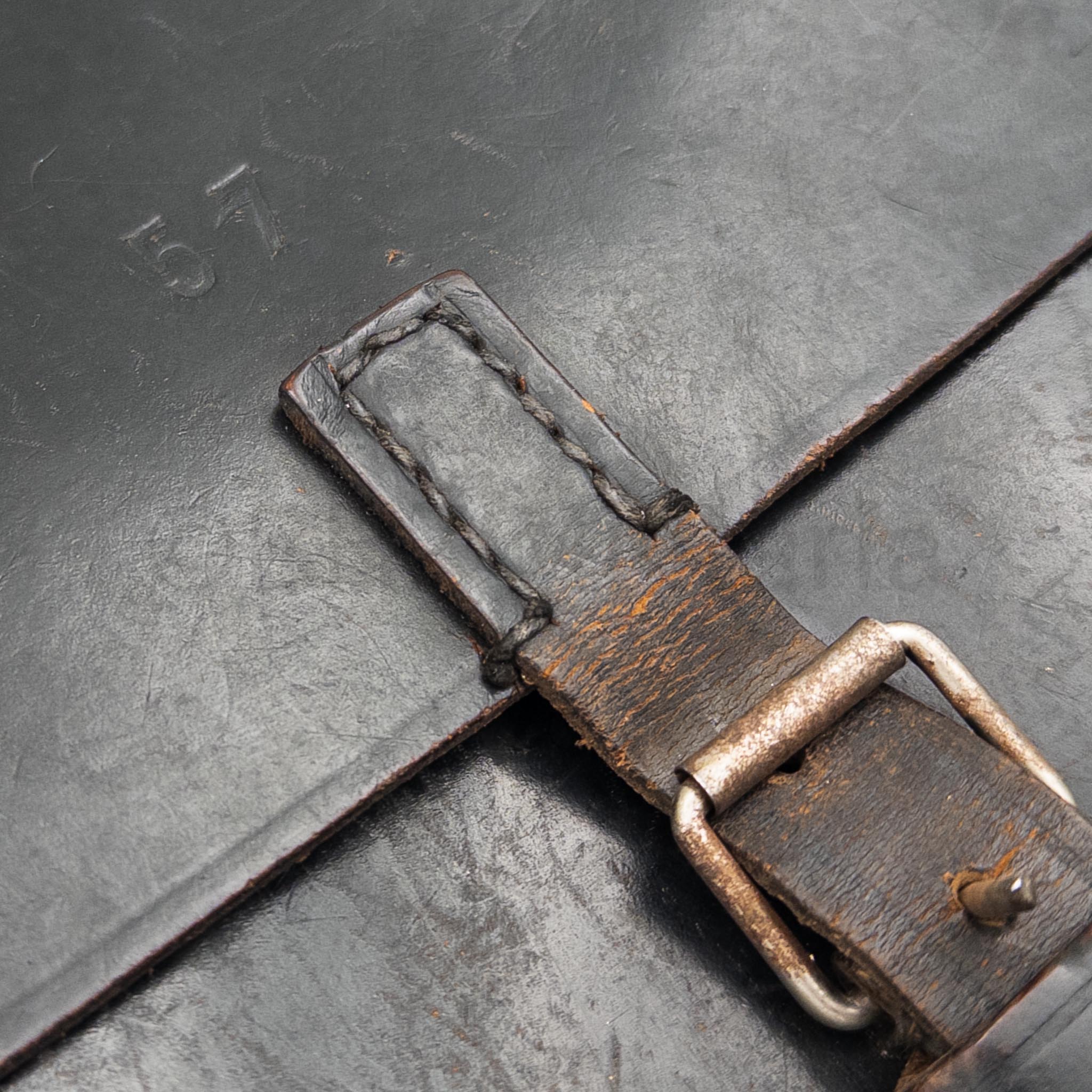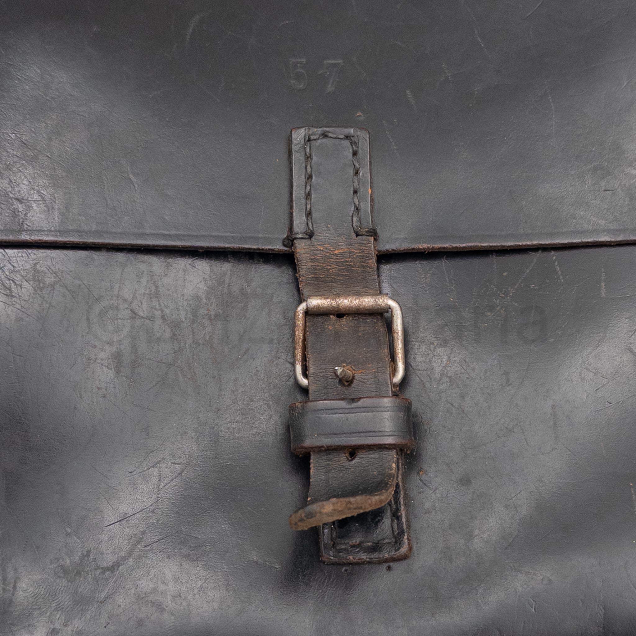 Prachtige zwarte leren tas met het nummer 57 erin gestanst aan de voorzijde en aan de achterzijde gemarkeerd met een moeilijk leesbare naam Frost & Jahnel? , Breslau 1939 en de Kriegsmarine adelaar.