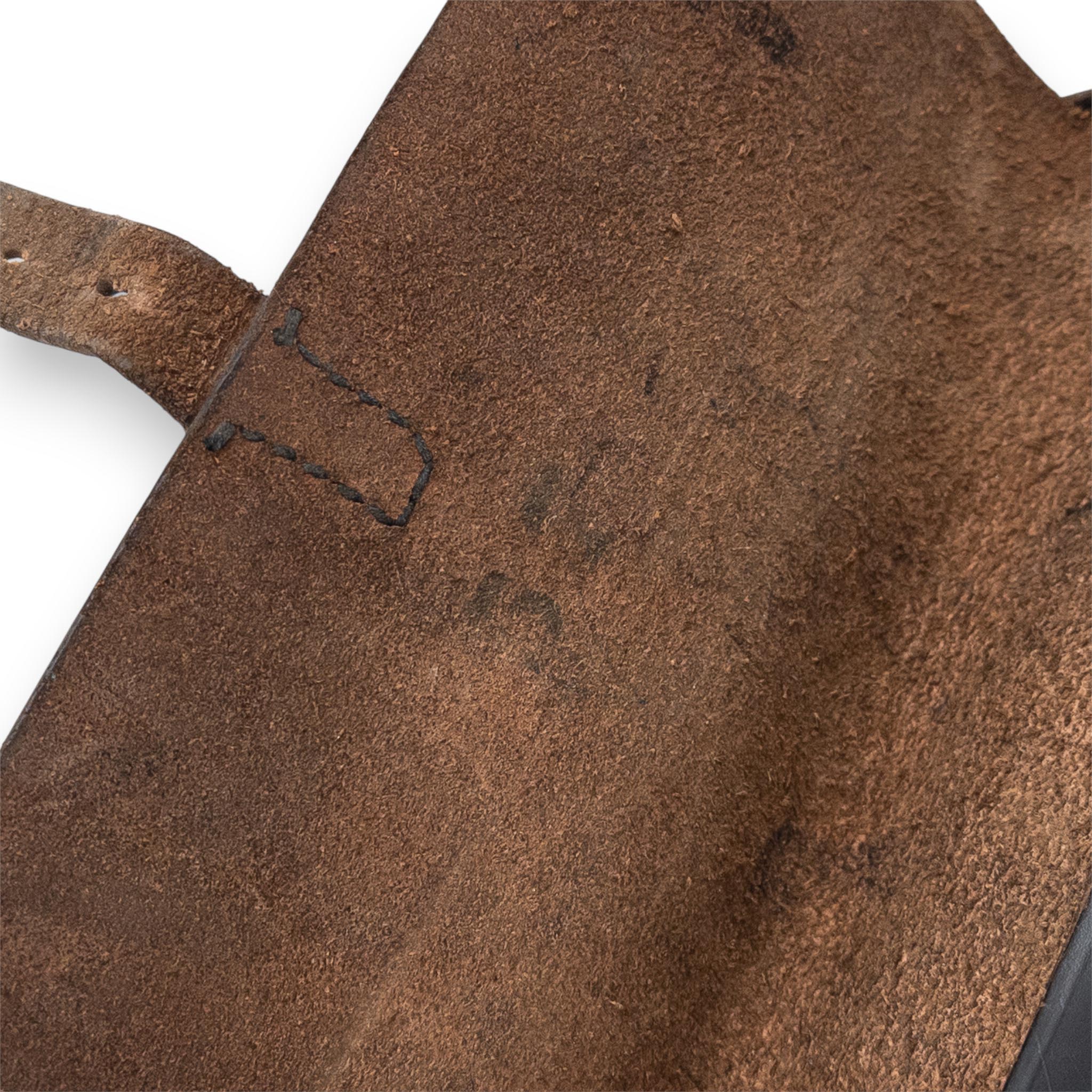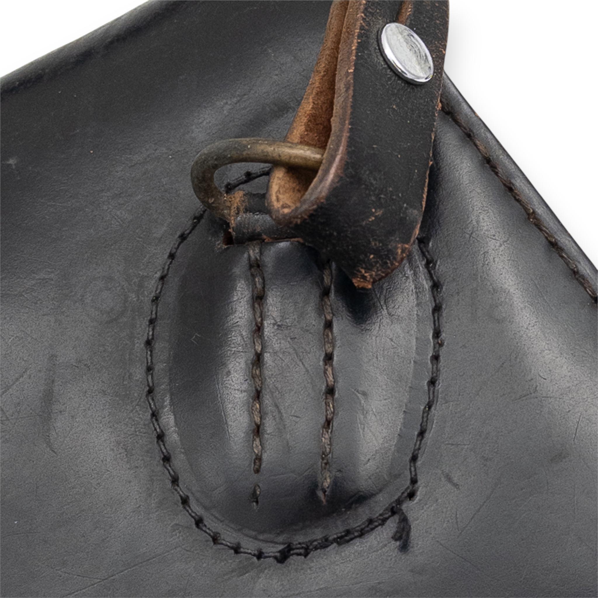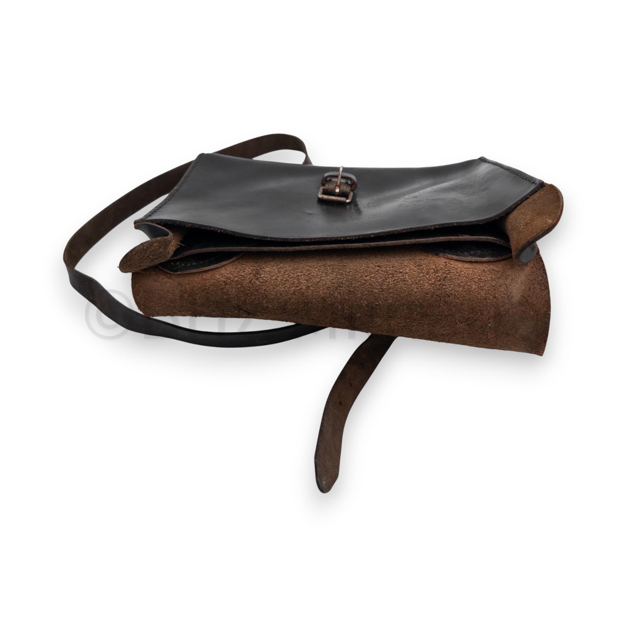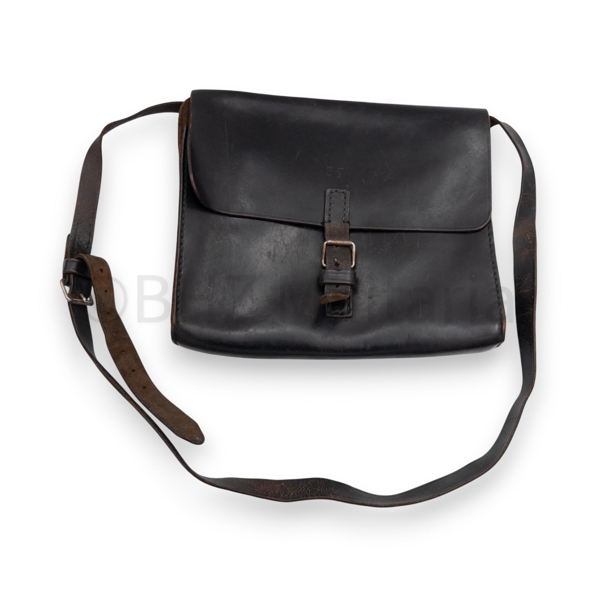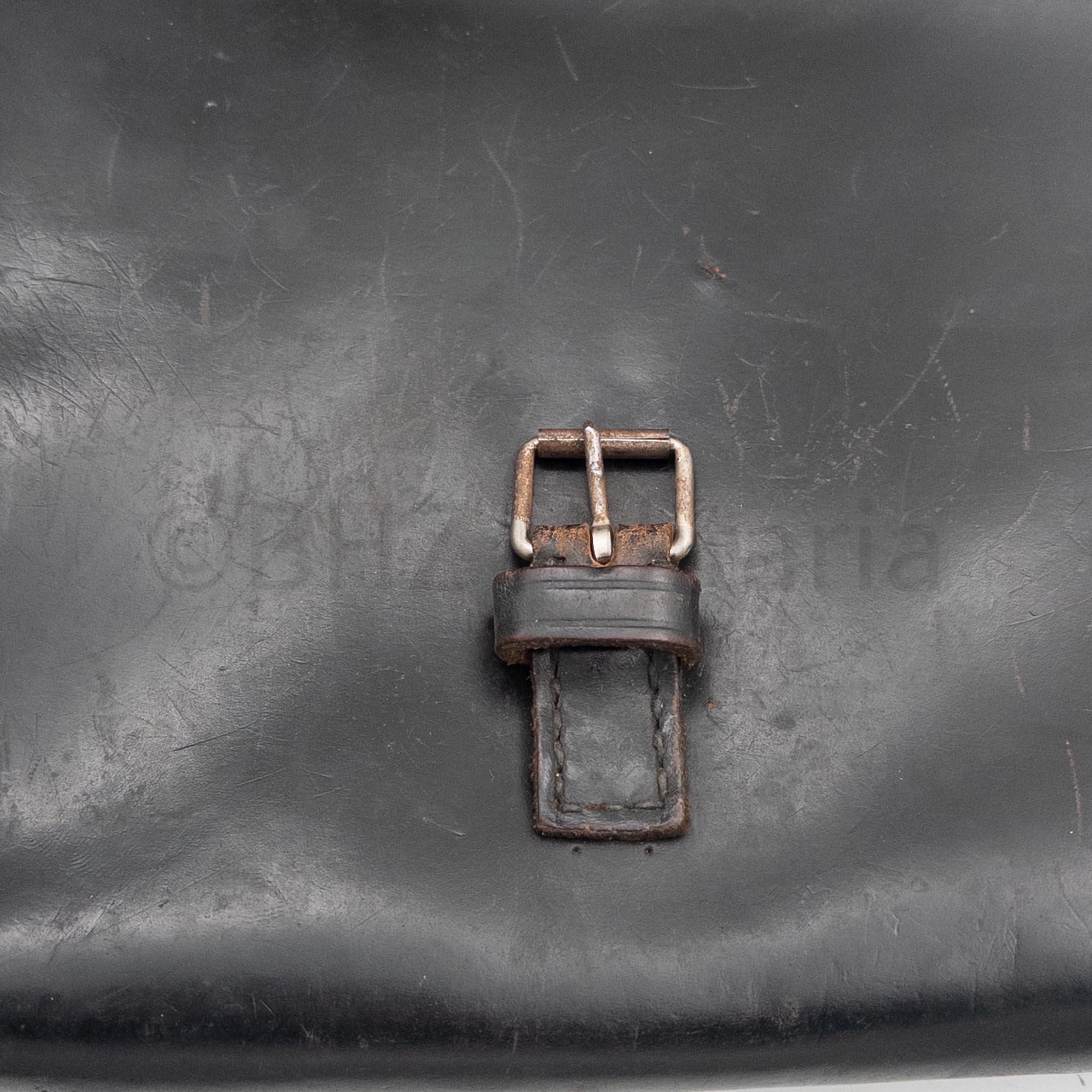 Prachtige zwarte leren tas met het nummer 57 erin gestanst aan de voorzijde en aan de achterzijde gemarkeerd met een moeilijk leesbare naam Frost & Jahnel? , Breslau 1939 en de Kriegsmarine adelaar.