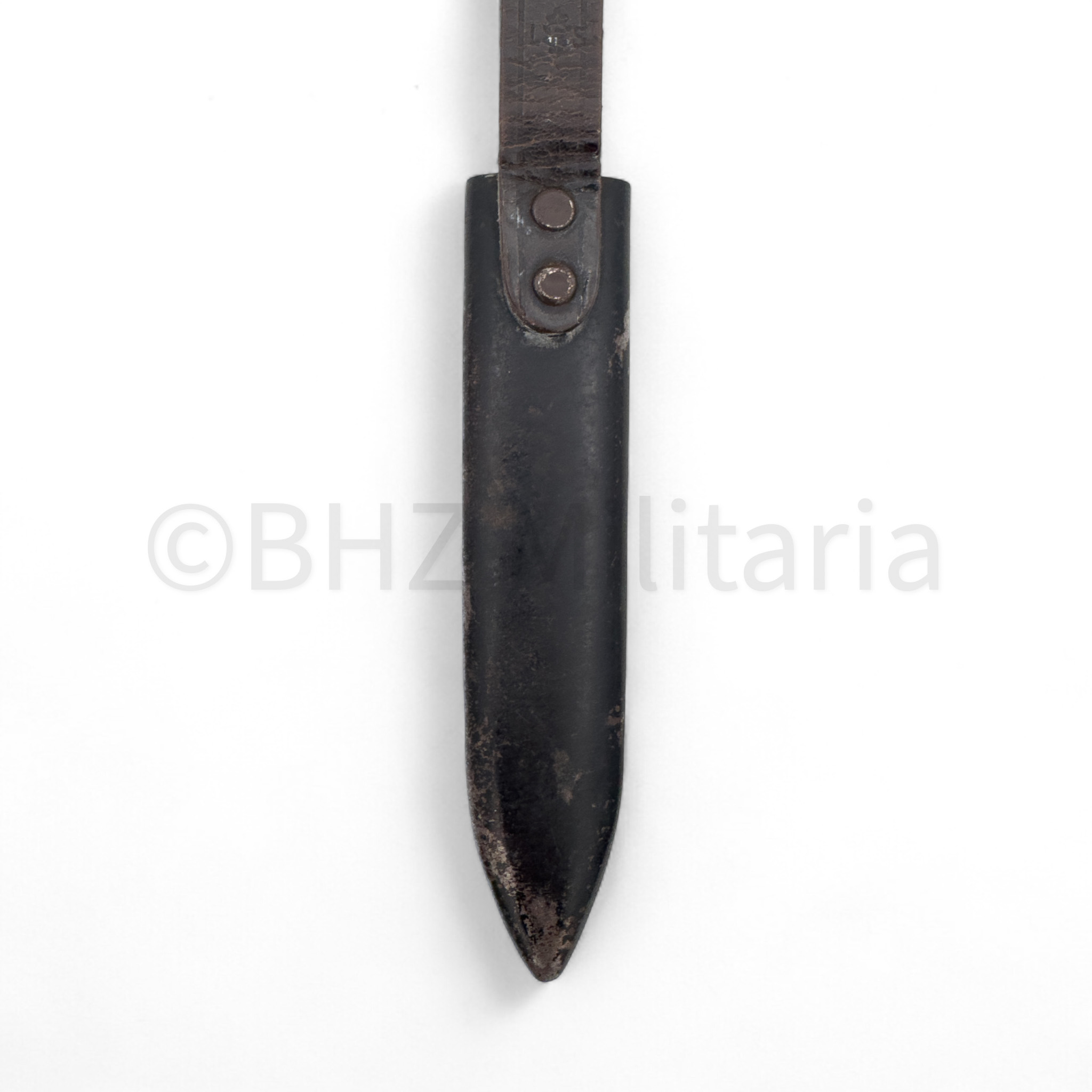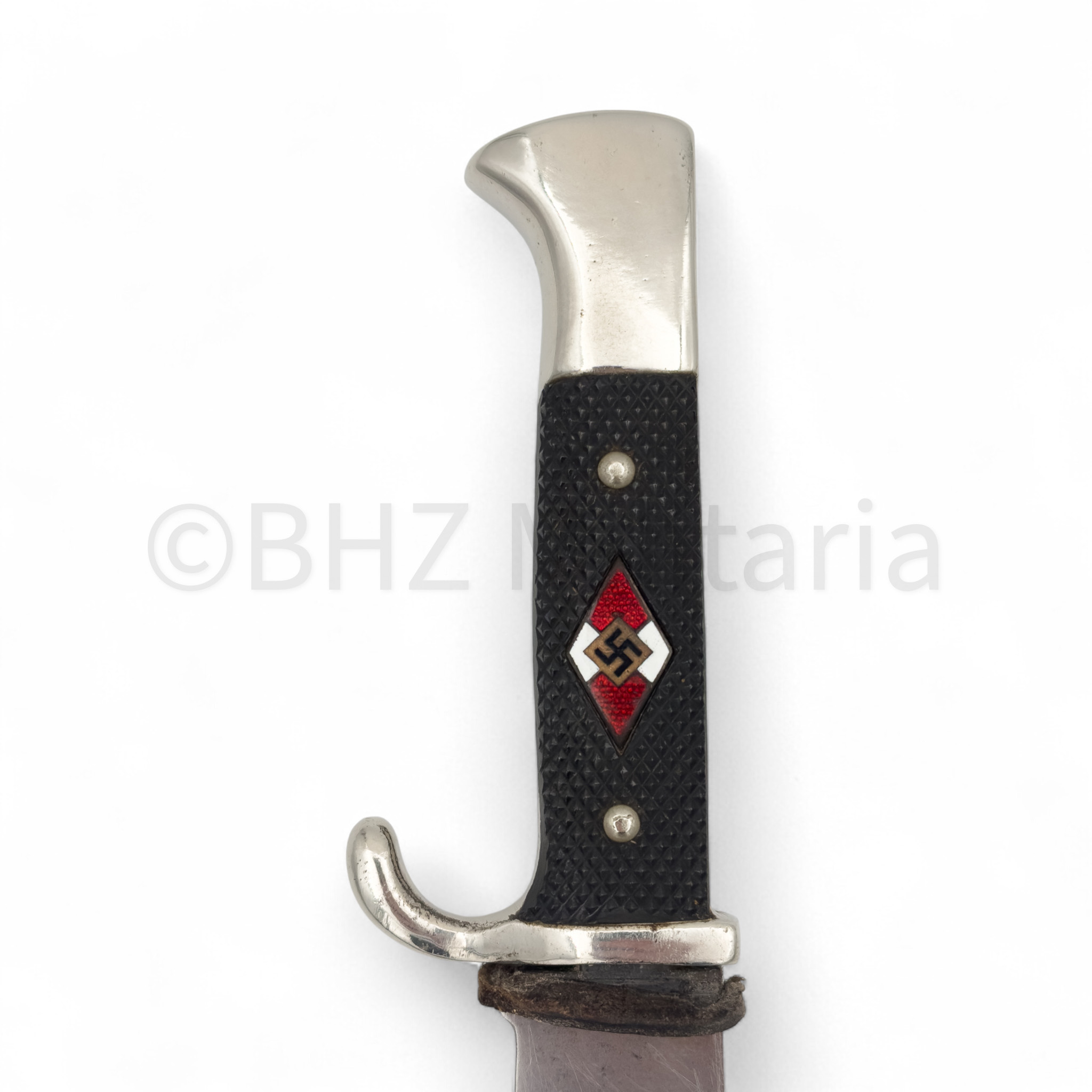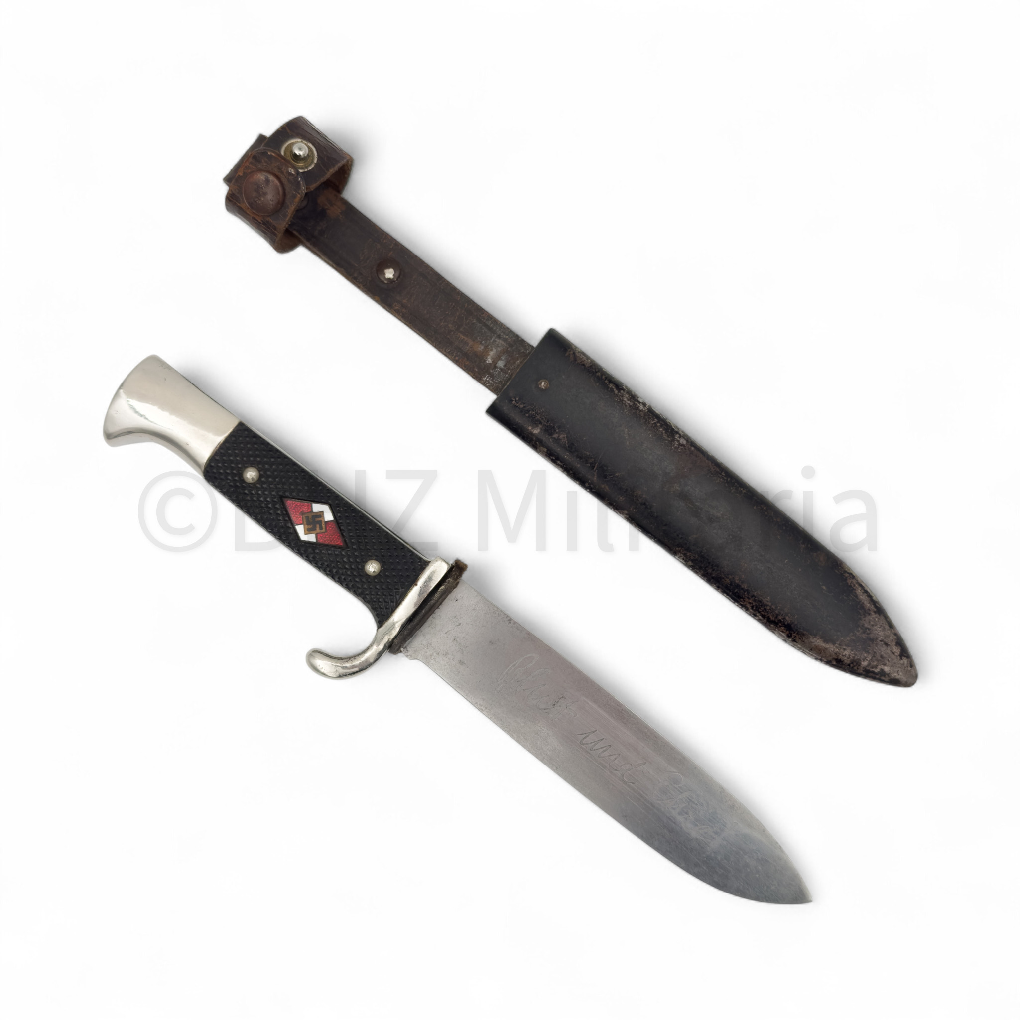 Prachtige originele en zeer fraaie Hitlerjugend (HJ) Dolk van de firma Hermann Konejung AG Stahlwarenfabrik uit Solingen. In het lemmet staat Blut und Ehre! en aan de andere zijde het firmastempel met Herm. Konejung AG Solingen en Ges Gesch. Het leertje van de dolk zit los en is leer is gebroken. Het originele lemmet heeft het bruine leren riempje en is eveneens in mooie staat. Kortom, een absolute topper voor de militaria verzameling!