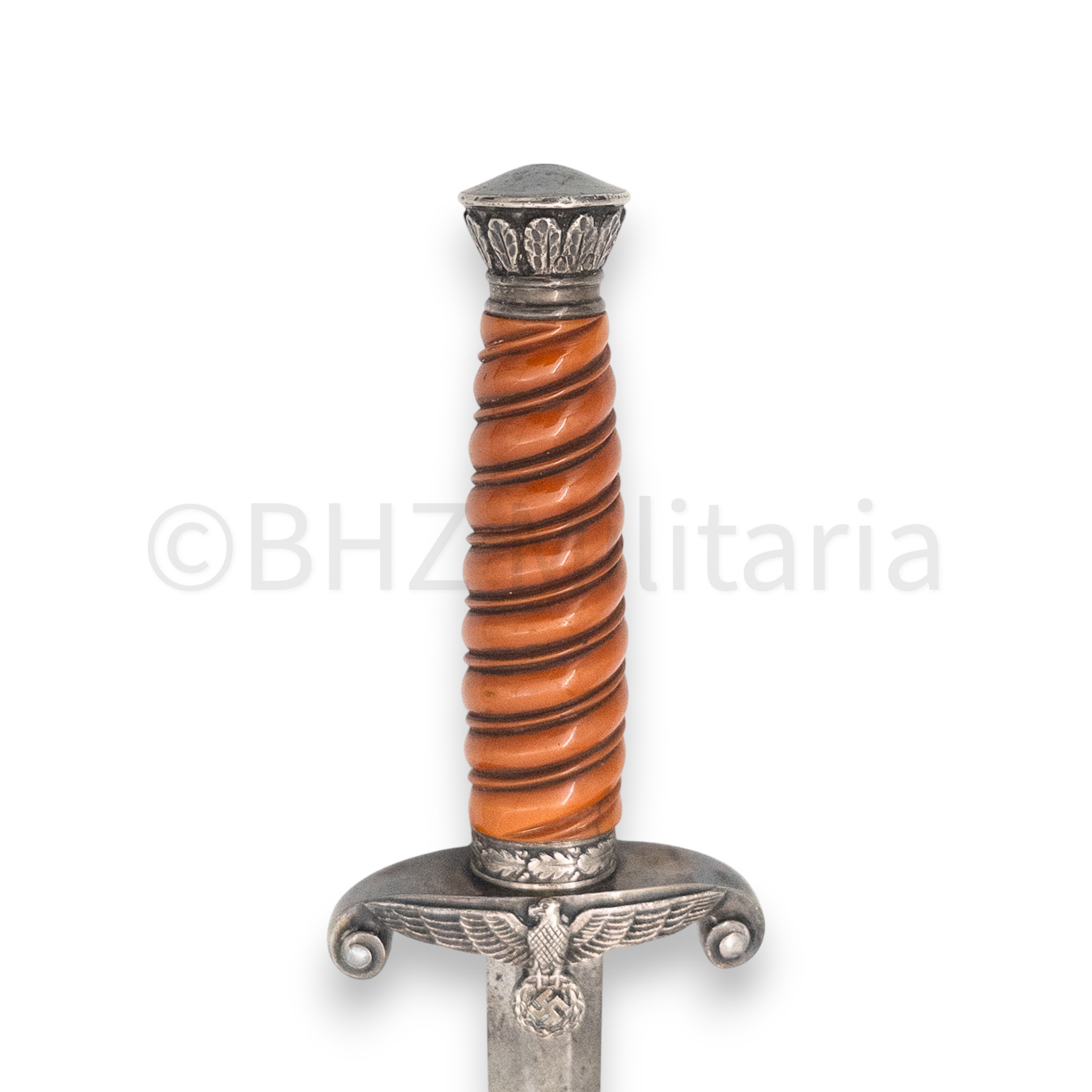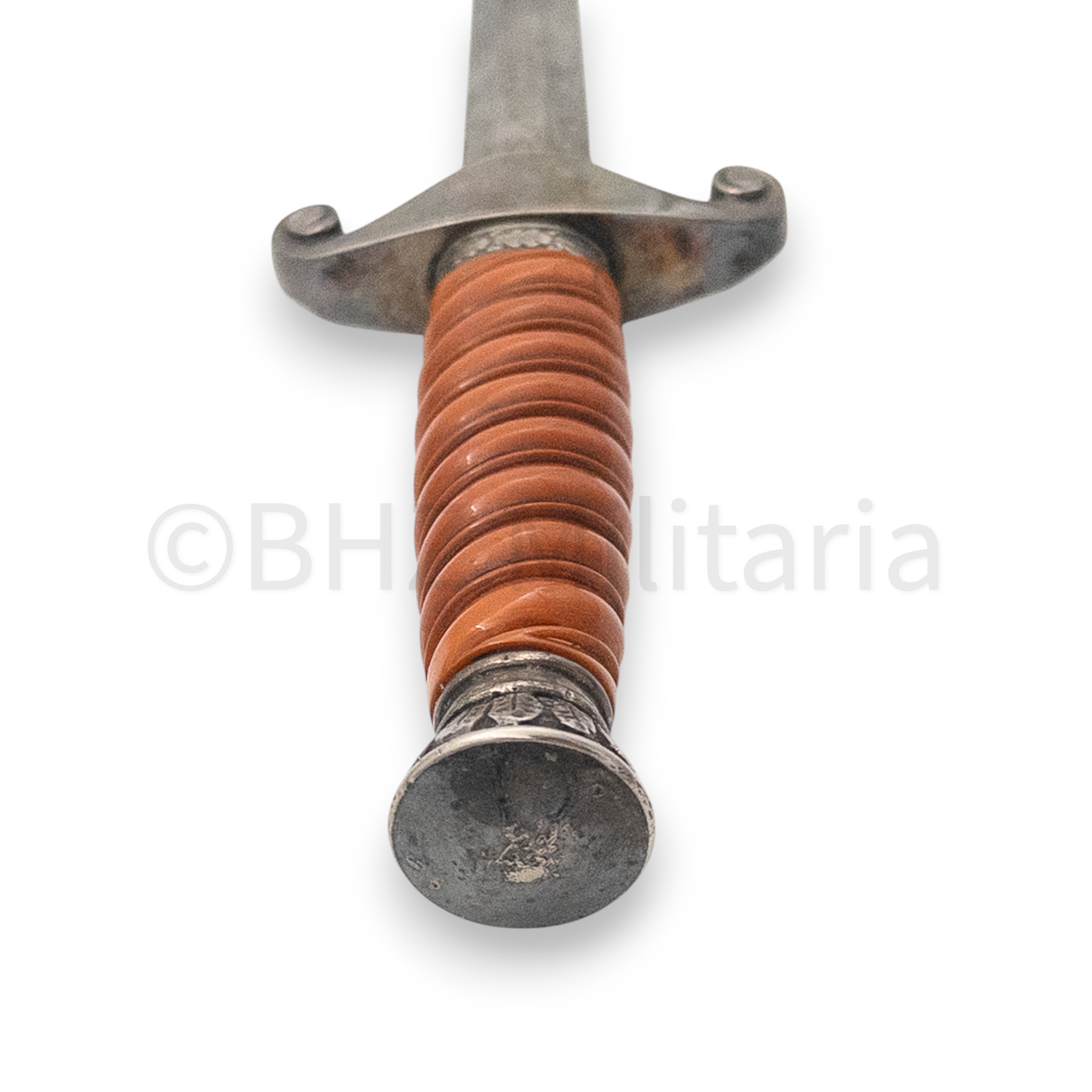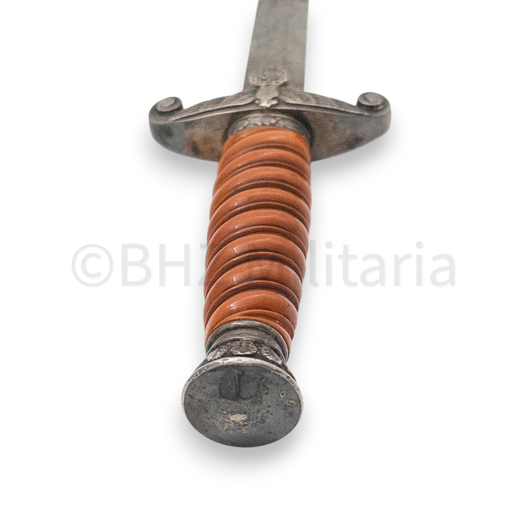 De dolk beschikt over een karakteristiek oranje celluloid handvat met een gedraaide diagonale structuur, wat het geheel een elegante en herkenbare uitstraling geeft. De originele nikkel-zilveren schede heeft een fraaie afwerking met gepebbelde voor- en achterzijde, terwijl de zijkanten glad en strak zijn uitgevoerd. Dit detail onderstreept de zorg en kwaliteit waarmee deze officiersdolk werd vervaardigd.