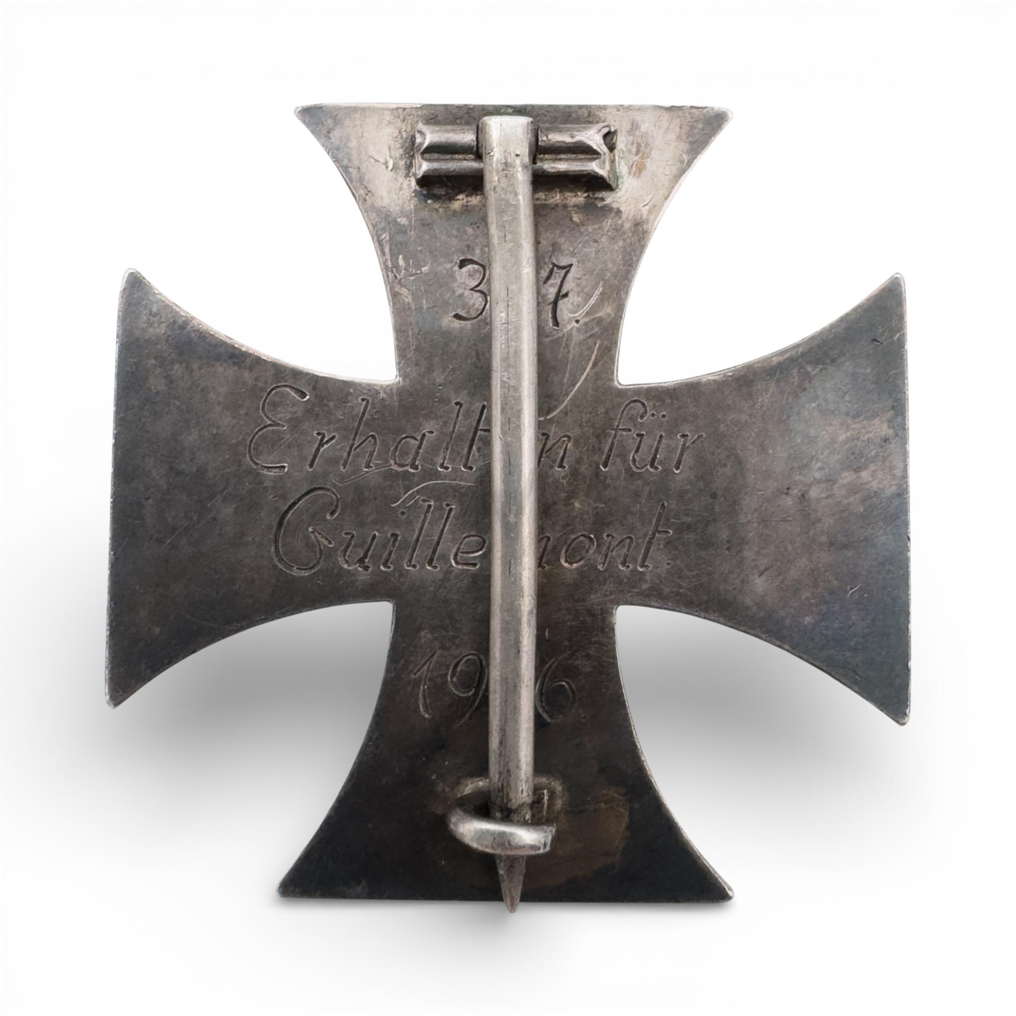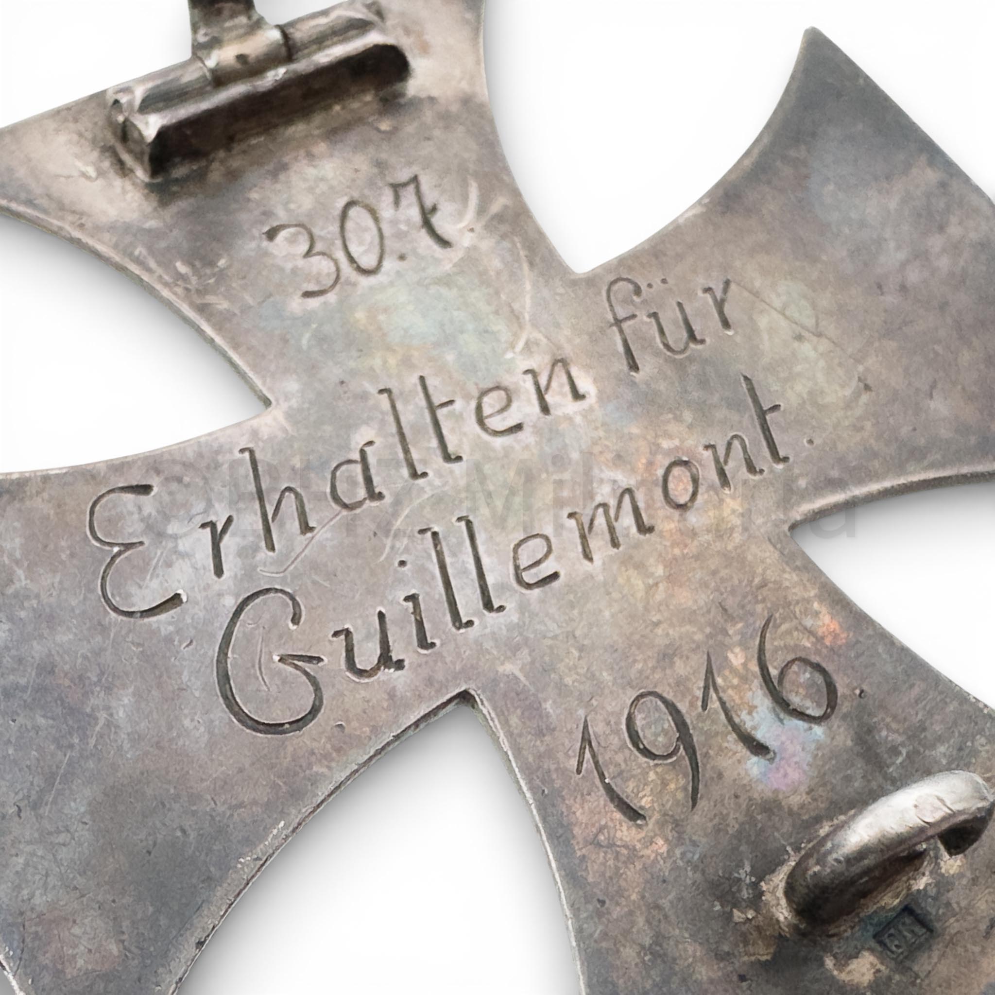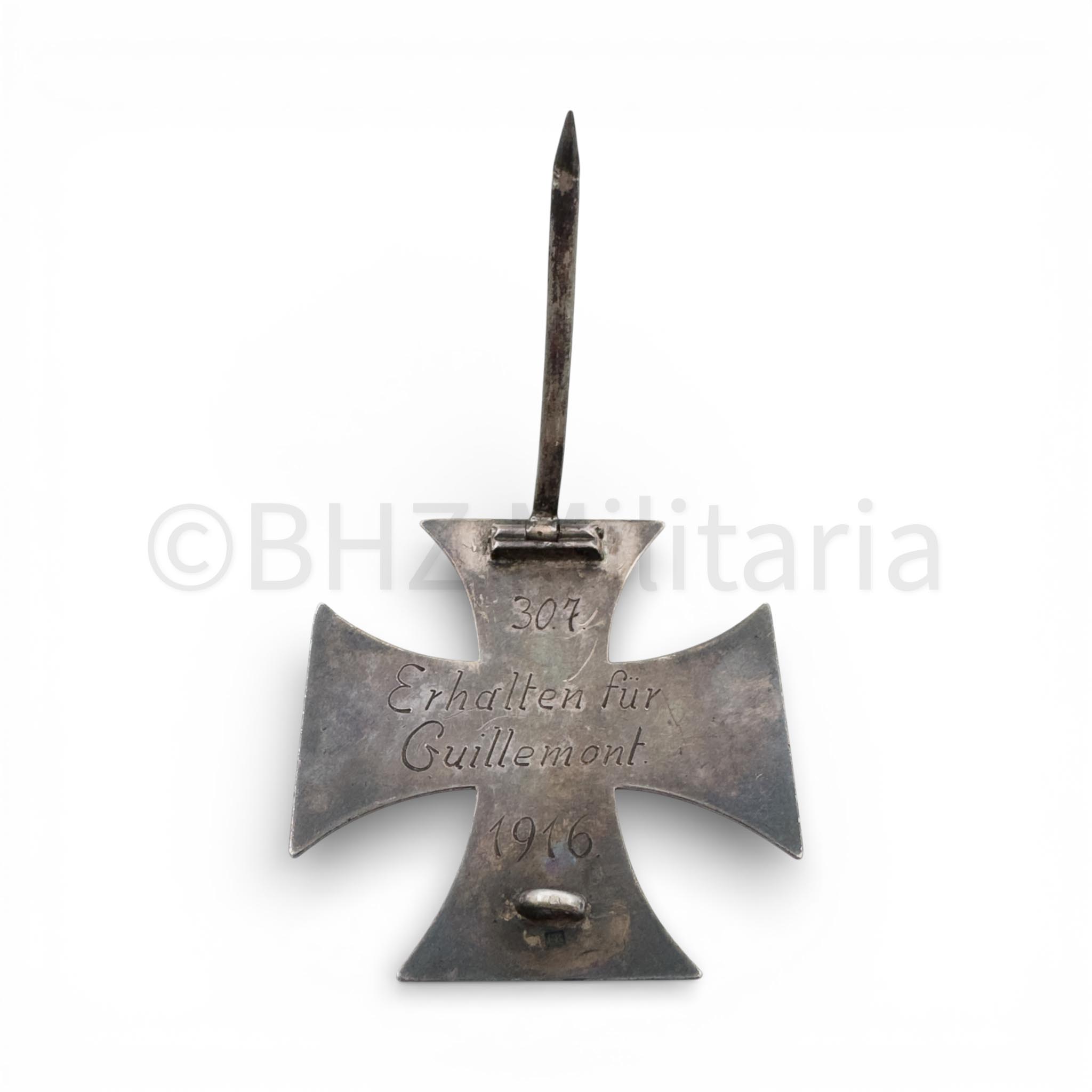 Het IJzeren Kruis is aan de achterzijde gegraveerd met “307 – Erhalten für Guillemont – 1916“.
