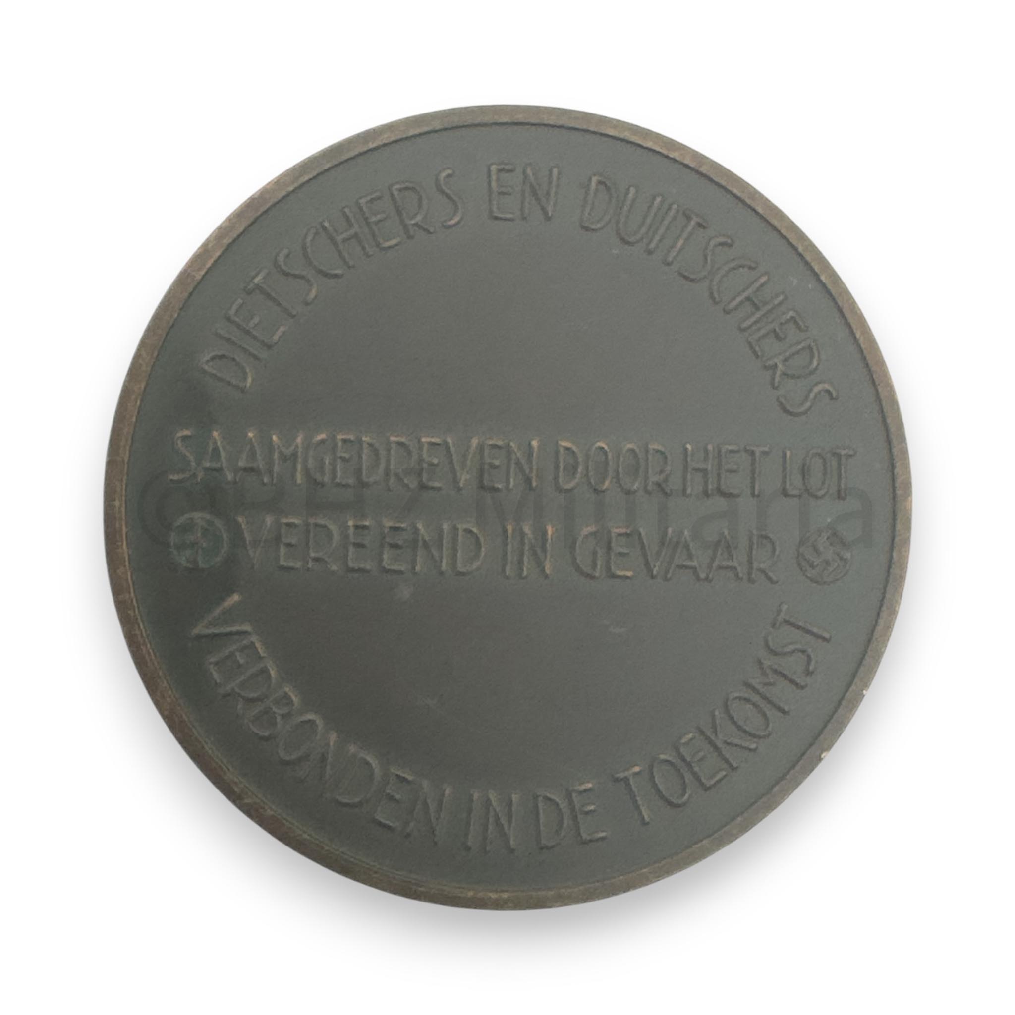 Fraaie originele koperen penning officieel “interneeringslegpenning” met aan de voorzijde de tekst “LOTSVERBONDENHEID 10-14 MEI 1940” en aan de achterzijde de tekst: “DIETSCHERS EN DUITSCHERS – SAAMGEDREVEN DOOR HET LOT – VEREEND IN GEVAAR – VERBONDEN IN DE TOEKOMST”. De penning heeft een diameter van 4cm. De voorkant van de penning lijkt met blanke lak behandelt te zijn.